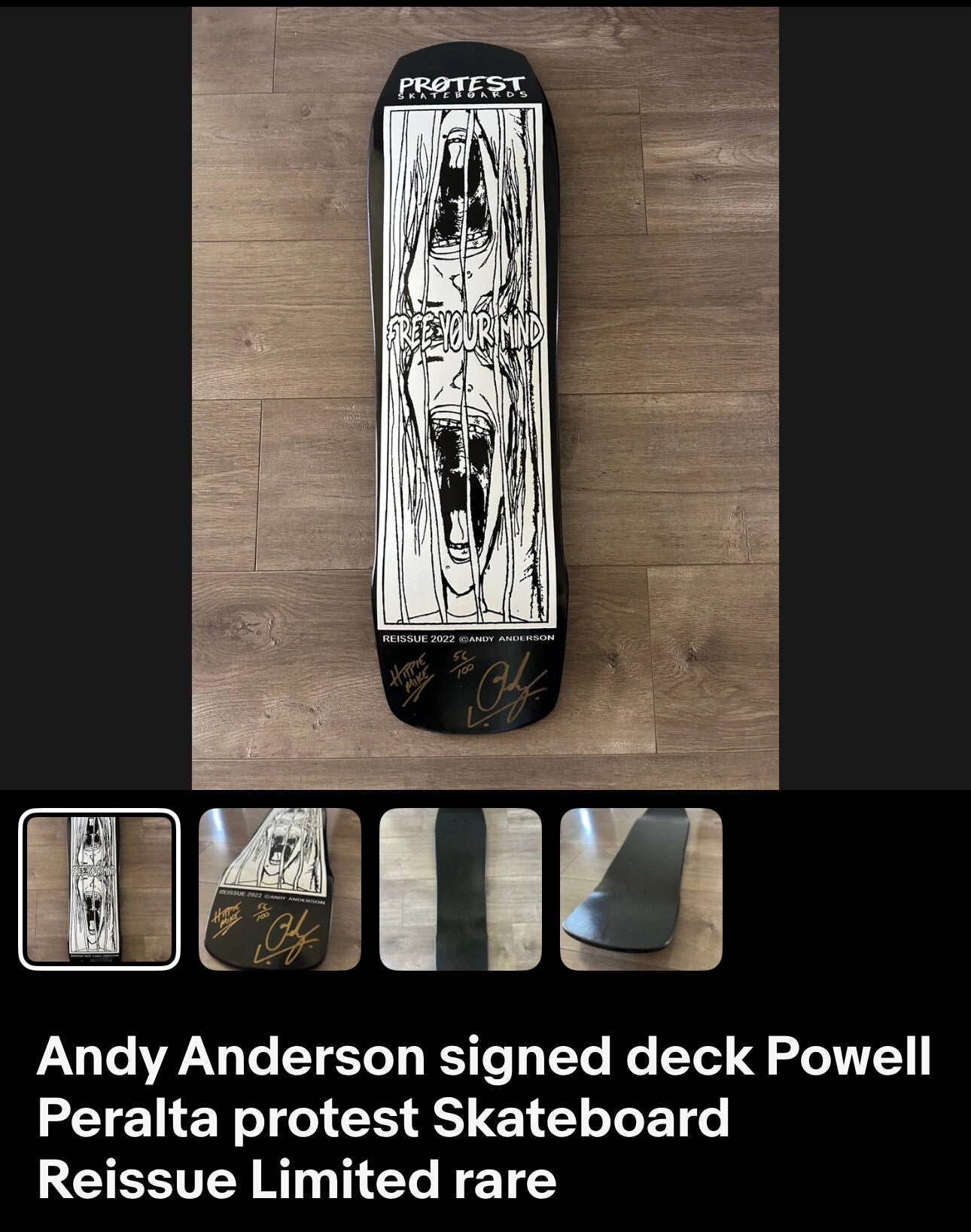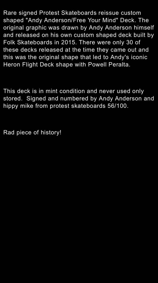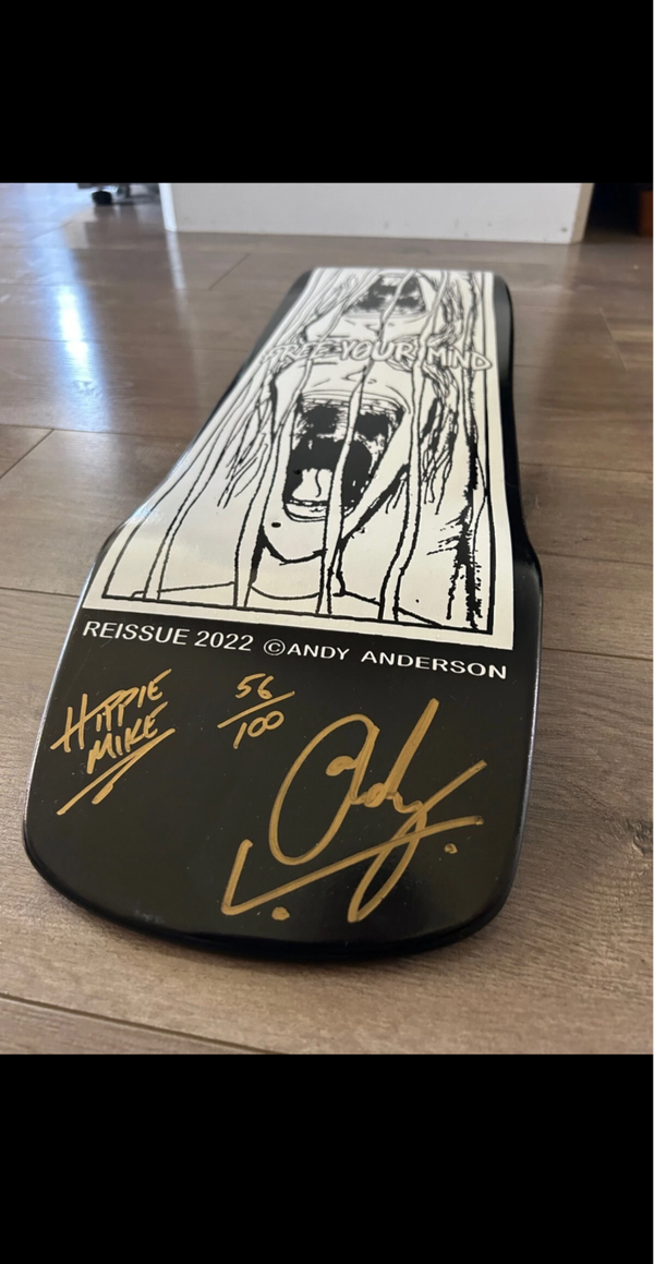 This is a super rare Andy Anderson 2015 model deck 57/100 signed by Andy Anderson. The graphic was drawn by Andy Anderson himself.
