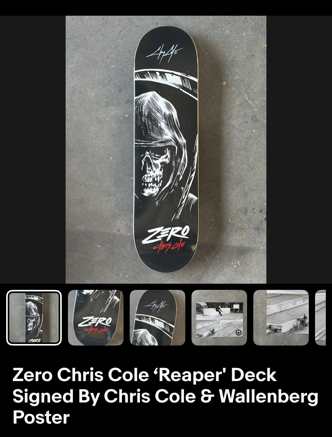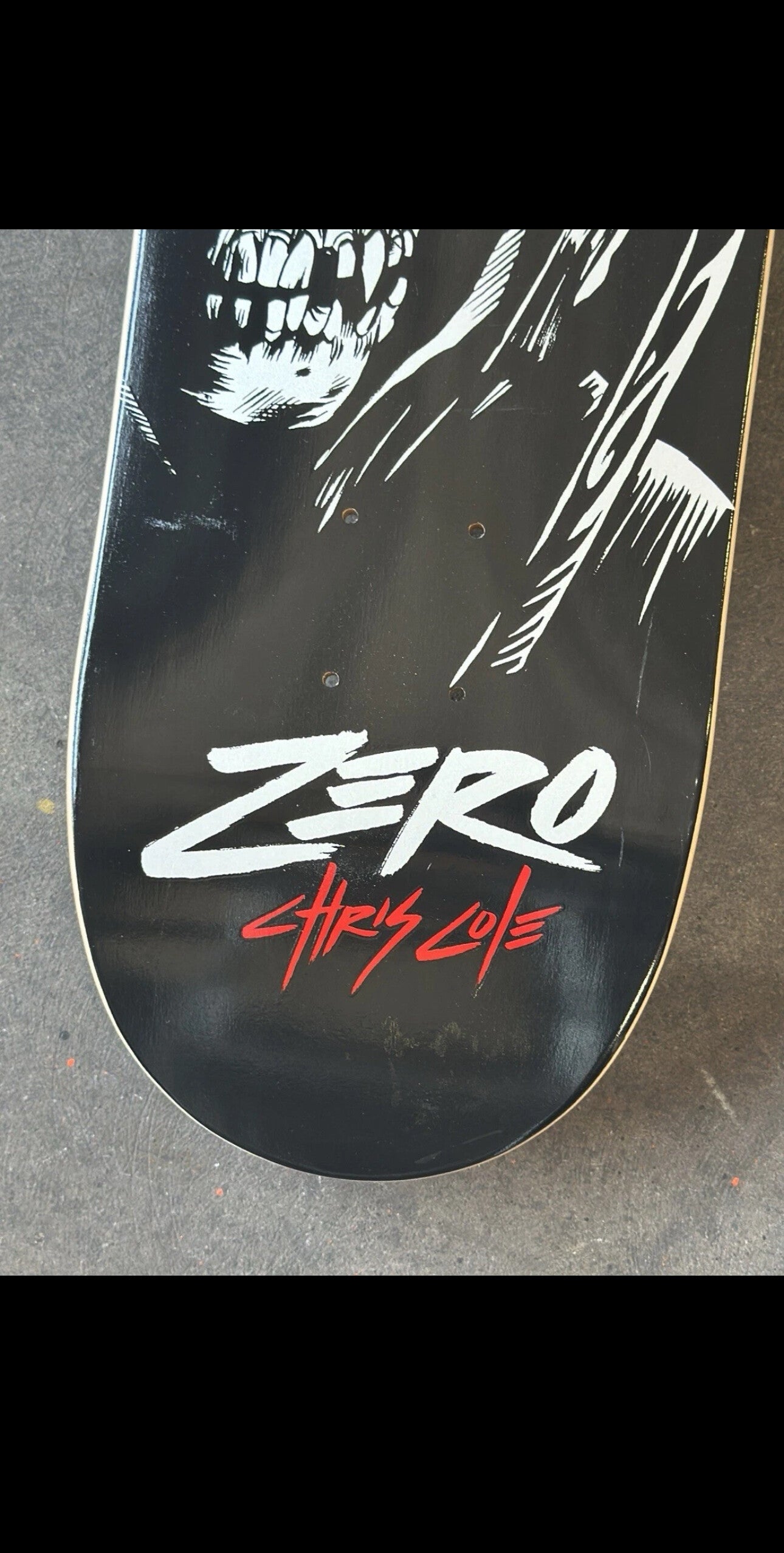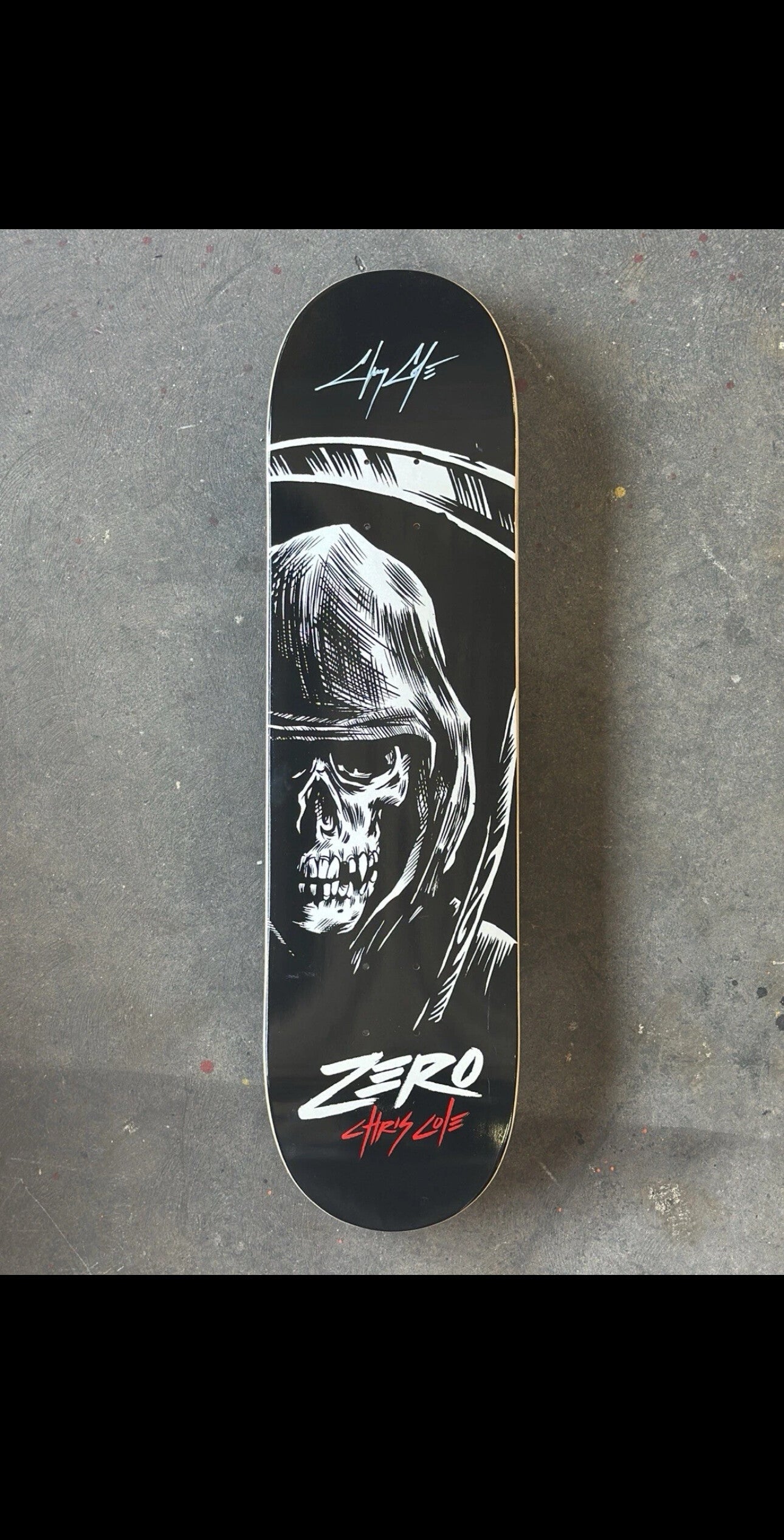 This skateboard is a autographed Pro skater Chris Cole Deck Previously sponsored by the skate company ZERO