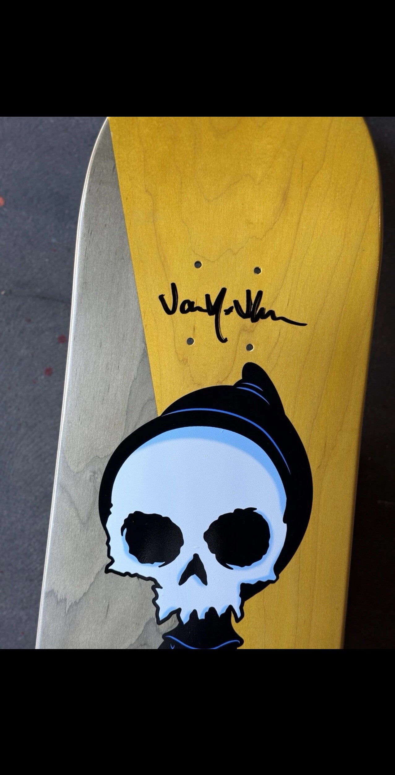 This skateboard is a Zero pro model deck Designed and signed by pro skater/ CEO Jamie Thomas for his 51st birthday on 10/11/25 this two tone graphic was never put out for sell and was never redesigned in the same way making it a 1-OFF a signed Zero ‘Lil Reaper’ one-off board. The board came on solid veneers so the split veneer is what make it unique. It also comes with a signed skull sticker.