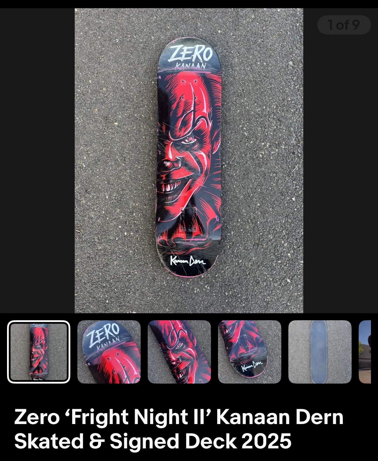 This skateboard is apart of the Fright Night II Series a rare series that the skateboard company Zero introduced in 2025 Halloween for the pro skater Kanaan Dern he also Signed and Skated this board as well!!!